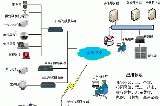 視頻監(jiān)控系統(tǒng):監(jiān)控系統(tǒng)是由攝像、傳輸、控制、顯示和記錄登記5大部分組成。攝像機(jī)通過(guò)同軸視頻電纜將視頻圖像傳輸?shù)娇刂浦鳈C(jī),控制主機(jī)再將視頻信號(hào)分配到各監(jiān)視器及錄像設(shè)備,同時(shí)可將需要傳輸?shù)恼Z(yǔ)音信號(hào)同步錄入到錄像機(jī)內(nèi)。過(guò)控制主機(jī),操作人員可發(fā)出指令,對(duì)云臺(tái)的上、下、左、右的動(dòng)作進(jìn)行控制及對(duì)鏡頭進(jìn)行調(diào)焦變倍的操作,并可通過(guò)控制主機(jī)實(shí)現(xiàn)在多路攝像機(jī)及云臺(tái)之間的切換。利用特殊的錄像處理模式,可對(duì)圖像進(jìn)行錄入、回放等操作,使錄像效果達(dá)到最佳。